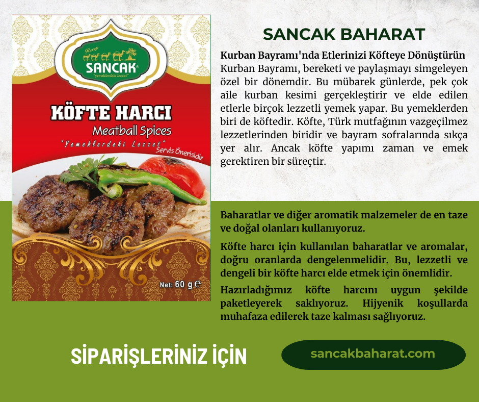 Malzeme Seçimi: Kaliteli köfte harcı için malzemelerin kalitesi önemlidir. Sancak Baharat tüm baharat malzemelerinde doğal ve organik ürün seçimine özen gösterir. Baharatlar ve diğer aromatik malzemeler en taze ve doğal olanları tercih edilmelidir.